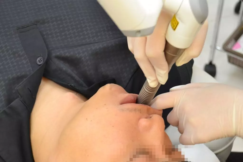 口の中からレーザーを照射して タルミを引き上げる スマイルリフト。今日も練習です。