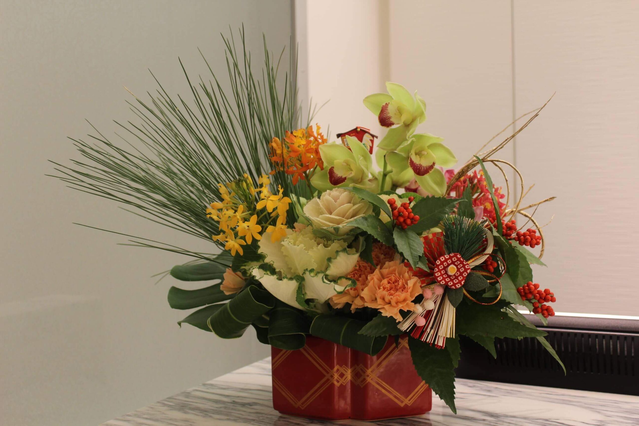 もう1月も下旬になっちゃいましたが、今年のお正月も受付に綺麗なお花をかざりました(*^_^*) 2017年のお花はこんな…